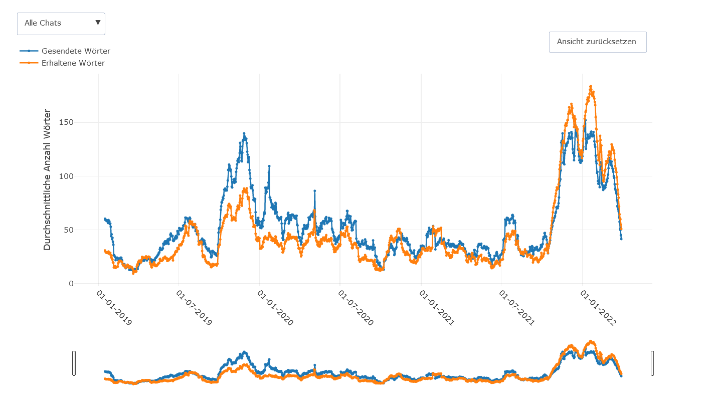 Sie erhalten Grafiken zu Ihrem Kommunikationsverhalten, z.B. in welchen Chats Sie am meisten schreiben, wann Sie am aktivsten sind und wie schnell Sie antworten. Diese Studie ist nicht als klinisch-psychologische Studie gedacht.